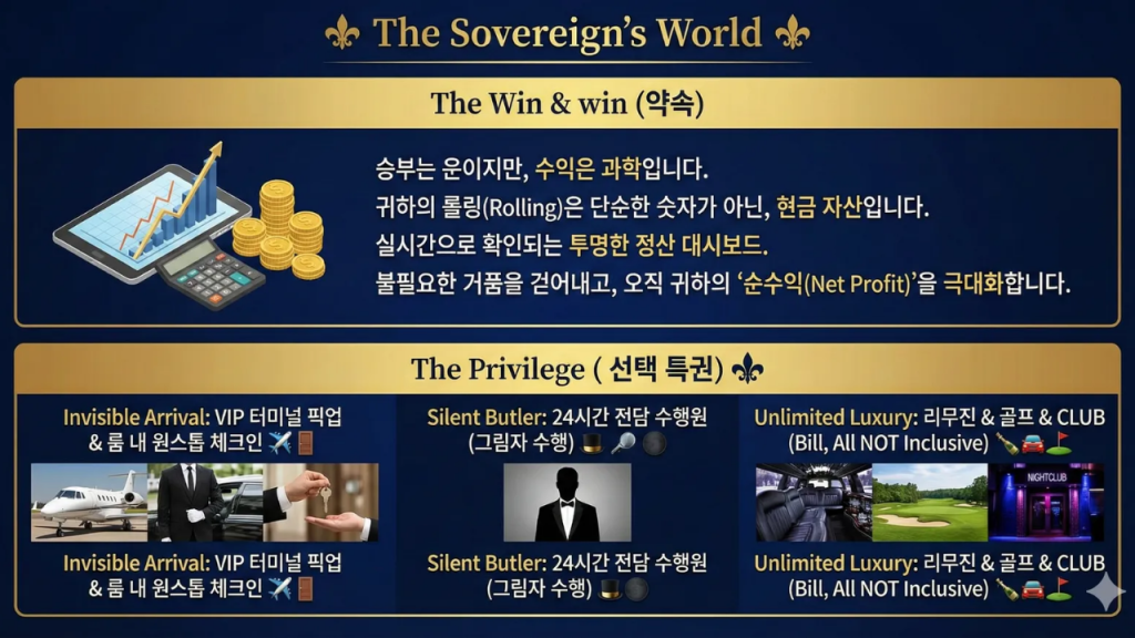 The Sovereign (군주) “당신이 만약 **’전략가’**라면, 오른쪽 문으로 오십시오. 우리는 당신에게 가짜 미소를 파는 대신, 진짜 수익(Profit)을 드립니다. 당신의 롤링이 실시간으로 현금이 되어 쌓이는 것을 눈으로 확인하십시오. 겉치레 비용을 모두 걷어내고, 오직 당신의 승률과 마진만을 계산하십시오. 이곳은 카지노가 아니라, 당신의 가장 확실한 투자처입니다.”